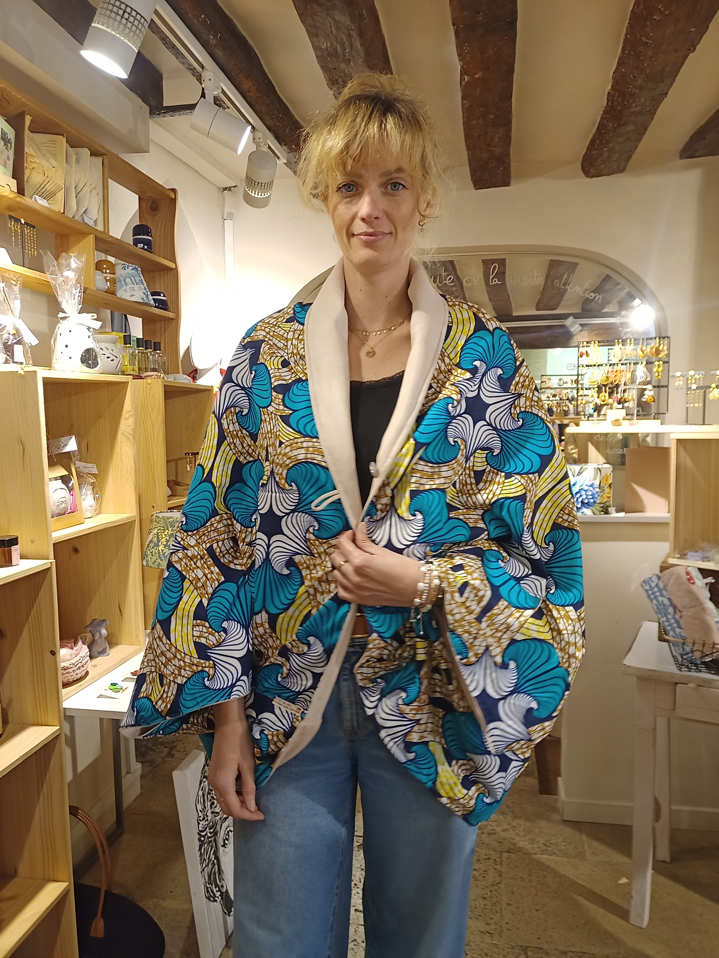 Apportez originalité et style avec cette veste longue réversible au motif wax turquoise vif. Polyvalente et tendance, elle se porte des deux côtés, alliant confort et modernité à vos tenues.